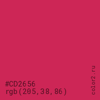 Цвет #CD2656 в цветовой модели RGB обозначается тремя октетами (205, 38, 86) в десятичном формате и #CD2656 в шестнадцатиричном (hex) формате, которые являются интенсивностью красного 205 (hex CD), интенсивность зелёного 38 (hex 26) и интенсивность синего 86 (hex 56).