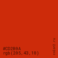 Цвет #CD2B0A в цветовой модели RGB обозначается тремя октетами (205, 43, 10) в десятичном формате и #CD2B0A в шестнадцатиричном (hex) формате, которые являются интенсивностью красного 205 (hex CD), интенсивность зелёного 43 (hex 2B) и интенсивность синего 10 (hex 0A).