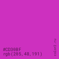 Цвет #CD30BF в цветовой модели RGB обозначается тремя октетами (205, 48, 191) в десятичном формате и #CD30BF в шестнадцатиричном (hex) формате, которые являются интенсивностью красного 205 (hex CD), интенсивность зелёного 48 (hex 30) и интенсивность синего 191 (hex BF).