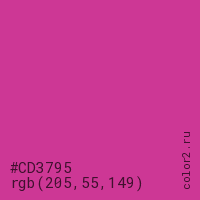 Цвет #CD3795 в цветовой модели RGB обозначается тремя октетами (205, 55, 149) в десятичном формате и #CD3795 в шестнадцатиричном (hex) формате, которые являются интенсивностью красного 205 (hex CD), интенсивность зелёного 55 (hex 37) и интенсивность синего 149 (hex 95).