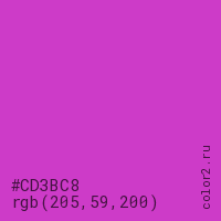 Цвет #CD3BC8 в цветовой модели RGB обозначается тремя октетами (205, 59, 200) в десятичном формате и #CD3BC8 в шестнадцатиричном (hex) формате, которые являются интенсивностью красного 205 (hex CD), интенсивность зелёного 59 (hex 3B) и интенсивность синего 200 (hex C8).