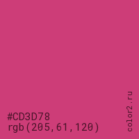 Цвет #CD3D78 в цветовой модели RGB обозначается тремя октетами (205, 61, 120) в десятичном формате и #CD3D78 в шестнадцатиричном (hex) формате, которые являются интенсивностью красного 205 (hex CD), интенсивность зелёного 61 (hex 3D) и интенсивность синего 120 (hex 78).