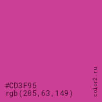 Цвет #CD3F95 в цветовой модели RGB обозначается тремя октетами (205, 63, 149) в десятичном формате и #CD3F95 в шестнадцатиричном (hex) формате, которые являются интенсивностью красного 205 (hex CD), интенсивность зелёного 63 (hex 3F) и интенсивность синего 149 (hex 95).