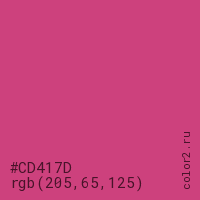 Цвет #CD417D в цветовой модели RGB обозначается тремя октетами (205, 65, 125) в десятичном формате и #CD417D в шестнадцатиричном (hex) формате, которые являются интенсивностью красного 205 (hex CD), интенсивность зелёного 65 (hex 41) и интенсивность синего 125 (hex 7D).