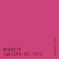 Цвет #CD4279 в цветовой модели RGB обозначается тремя октетами (205, 66, 121) в десятичном формате и #CD4279 в шестнадцатиричном (hex) формате, которые являются интенсивностью красного 205 (hex CD), интенсивность зелёного 66 (hex 42) и интенсивность синего 121 (hex 79).