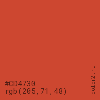 Цвет #CD4730 в цветовой модели RGB обозначается тремя октетами (205, 71, 48) в десятичном формате и #CD4730 в шестнадцатиричном (hex) формате, которые являются интенсивностью красного 205 (hex CD), интенсивность зелёного 71 (hex 47) и интенсивность синего 48 (hex 30).
