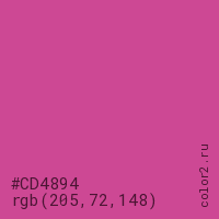 Цвет #CD4894 в цветовой модели RGB обозначается тремя октетами (205, 72, 148) в десятичном формате и #CD4894 в шестнадцатиричном (hex) формате, которые являются интенсивностью красного 205 (hex CD), интенсивность зелёного 72 (hex 48) и интенсивность синего 148 (hex 94).