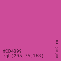 Цвет #CD4B99 в цветовой модели RGB обозначается тремя октетами (205, 75, 153) в десятичном формате и #CD4B99 в шестнадцатиричном (hex) формате, которые являются интенсивностью красного 205 (hex CD), интенсивность зелёного 75 (hex 4B) и интенсивность синего 153 (hex 99).
