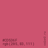 Цвет #CD536F в цветовой модели RGB обозначается тремя октетами (205, 83, 111) в десятичном формате и #CD536F в шестнадцатиричном (hex) формате, которые являются интенсивностью красного 205 (hex CD), интенсивность зелёного 83 (hex 53) и интенсивность синего 111 (hex 6F).