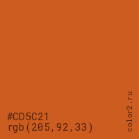 Цвет #CD5C21 в цветовой модели RGB обозначается тремя октетами (205, 92, 33) в десятичном формате и #CD5C21 в шестнадцатиричном (hex) формате, которые являются интенсивностью красного 205 (hex CD), интенсивность зелёного 92 (hex 5C) и интенсивность синего 33 (hex 21).