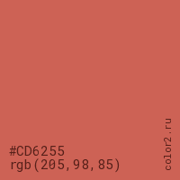 Цвет #CD6255 в цветовой модели RGB обозначается тремя октетами (205, 98, 85) в десятичном формате и #CD6255 в шестнадцатиричном (hex) формате, которые являются интенсивностью красного 205 (hex CD), интенсивность зелёного 98 (hex 62) и интенсивность синего 85 (hex 55).