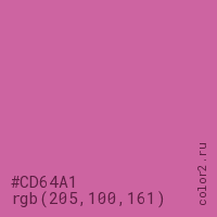 Цвет #CD64A1 в цветовой модели RGB обозначается тремя октетами (205, 100, 161) в десятичном формате и #CD64A1 в шестнадцатиричном (hex) формате, которые являются интенсивностью красного 205 (hex CD), интенсивность зелёного 100 (hex 64) и интенсивность синего 161 (hex A1).