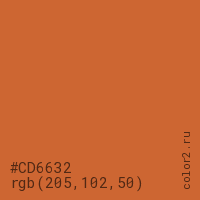 Цвет #CD6632 в цветовой модели RGB обозначается тремя октетами (205, 102, 50) в десятичном формате и #CD6632 в шестнадцатиричном (hex) формате, которые являются интенсивностью красного 205 (hex CD), интенсивность зелёного 102 (hex 66) и интенсивность синего 50 (hex 32).
