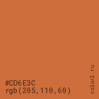 Цвет #CD6E3C в цветовой модели RGB обозначается тремя октетами (205, 110, 60) в десятичном формате и #CD6E3C в шестнадцатиричном (hex) формате, которые являются интенсивностью красного 205 (hex CD), интенсивность зелёного 110 (hex 6E) и интенсивность синего 60 (hex 3C).