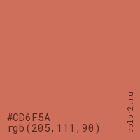 Цвет #CD6F5A в цветовой модели RGB обозначается тремя октетами (205, 111, 90) в десятичном формате и #CD6F5A в шестнадцатиричном (hex) формате, которые являются интенсивностью красного 205 (hex CD), интенсивность зелёного 111 (hex 6F) и интенсивность синего 90 (hex 5A).