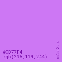 Цвет #CD77F4 в цветовой модели RGB обозначается тремя октетами (205, 119, 244) в десятичном формате и #CD77F4 в шестнадцатиричном (hex) формате, которые являются интенсивностью красного 205 (hex CD), интенсивность зелёного 119 (hex 77) и интенсивность синего 244 (hex F4).