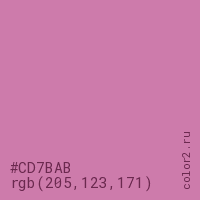 Цвет #CD7BAB в цветовой модели RGB обозначается тремя октетами (205, 123, 171) в десятичном формате и #CD7BAB в шестнадцатиричном (hex) формате, которые являются интенсивностью красного 205 (hex CD), интенсивность зелёного 123 (hex 7B) и интенсивность синего 171 (hex AB).