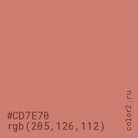Цвет #CD7E70 в цветовой модели RGB обозначается тремя октетами (205, 126, 112) в десятичном формате и #CD7E70 в шестнадцатиричном (hex) формате, которые являются интенсивностью красного 205 (hex CD), интенсивность зелёного 126 (hex 7E) и интенсивность синего 112 (hex 70).