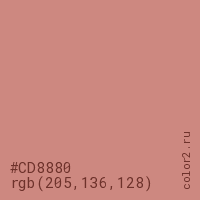 Цвет #CD8880 в цветовой модели RGB обозначается тремя октетами (205, 136, 128) в десятичном формате и #CD8880 в шестнадцатиричном (hex) формате, которые являются интенсивностью красного 205 (hex CD), интенсивность зелёного 136 (hex 88) и интенсивность синего 128 (hex 80).
