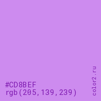 Цвет #CD8BEF в цветовой модели RGB обозначается тремя октетами (205, 139, 239) в десятичном формате и #CD8BEF в шестнадцатиричном (hex) формате, которые являются интенсивностью красного 205 (hex CD), интенсивность зелёного 139 (hex 8B) и интенсивность синего 239 (hex EF).