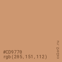 Цвет #CD9770 в цветовой модели RGB обозначается тремя октетами (205, 151, 112) в десятичном формате и #CD9770 в шестнадцатиричном (hex) формате, которые являются интенсивностью красного 205 (hex CD), интенсивность зелёного 151 (hex 97) и интенсивность синего 112 (hex 70).