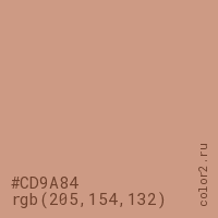 Цвет #CD9A84 в цветовой модели RGB обозначается тремя октетами (205, 154, 132) в десятичном формате и #CD9A84 в шестнадцатиричном (hex) формате, которые являются интенсивностью красного 205 (hex CD), интенсивность зелёного 154 (hex 9A) и интенсивность синего 132 (hex 84).