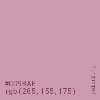 Цвет #CD9BAF в цветовой модели RGB обозначается тремя октетами (205, 155, 175) в десятичном формате и #CD9BAF в шестнадцатиричном (hex) формате, которые являются интенсивностью красного 205 (hex CD), интенсивность зелёного 155 (hex 9B) и интенсивность синего 175 (hex AF).
