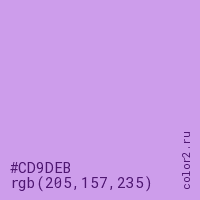 Цвет #CD9DEB в цветовой модели RGB обозначается тремя октетами (205, 157, 235) в десятичном формате и #CD9DEB в шестнадцатиричном (hex) формате, которые являются интенсивностью красного 205 (hex CD), интенсивность зелёного 157 (hex 9D) и интенсивность синего 235 (hex EB).