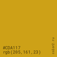 Цвет #CDA117 в цветовой модели RGB обозначается тремя октетами (205, 161, 23) в десятичном формате и #CDA117 в шестнадцатиричном (hex) формате, которые являются интенсивностью красного 205 (hex CD), интенсивность зелёного 161 (hex A1) и интенсивность синего 23 (hex 17).