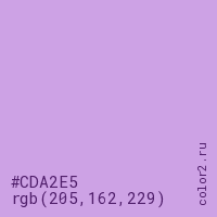Цвет #CDA2E5 в цветовой модели RGB обозначается тремя октетами (205, 162, 229) в десятичном формате и #CDA2E5 в шестнадцатиричном (hex) формате, которые являются интенсивностью красного 205 (hex CD), интенсивность зелёного 162 (hex A2) и интенсивность синего 229 (hex E5).