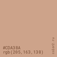 Цвет #CDA38A в цветовой модели RGB обозначается тремя октетами (205, 163, 138) в десятичном формате и #CDA38A в шестнадцатиричном (hex) формате, которые являются интенсивностью красного 205 (hex CD), интенсивность зелёного 163 (hex A3) и интенсивность синего 138 (hex 8A).