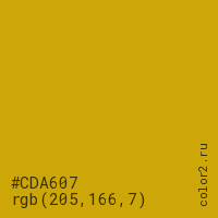 Цвет #CDA607 в цветовой модели RGB обозначается тремя октетами (205, 166, 7) в десятичном формате и #CDA607 в шестнадцатиричном (hex) формате, которые являются интенсивностью красного 205 (hex CD), интенсивность зелёного 166 (hex A6) и интенсивность синего 7 (hex 07).