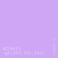 Цвет #CDA6F5 в цветовой модели RGB обозначается тремя октетами (205, 166, 245) в десятичном формате и #CDA6F5 в шестнадцатиричном (hex) формате, которые являются интенсивностью красного 205 (hex CD), интенсивность зелёного 166 (hex A6) и интенсивность синего 245 (hex F5).