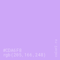 Цвет #CDA6F8 в цветовой модели RGB обозначается тремя октетами (205, 166, 248) в десятичном формате и #CDA6F8 в шестнадцатиричном (hex) формате, которые являются интенсивностью красного 205 (hex CD), интенсивность зелёного 166 (hex A6) и интенсивность синего 248 (hex F8).