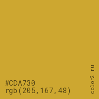 Цвет #CDA730 в цветовой модели RGB обозначается тремя октетами (205, 167, 48) в десятичном формате и #CDA730 в шестнадцатиричном (hex) формате, которые являются интенсивностью красного 205 (hex CD), интенсивность зелёного 167 (hex A7) и интенсивность синего 48 (hex 30).