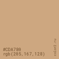 Цвет #CDA780 в цветовой модели RGB обозначается тремя октетами (205, 167, 128) в десятичном формате и #CDA780 в шестнадцатиричном (hex) формате, которые являются интенсивностью красного 205 (hex CD), интенсивность зелёного 167 (hex A7) и интенсивность синего 128 (hex 80).