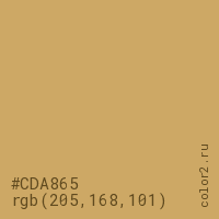 Цвет #CDA865 в цветовой модели RGB обозначается тремя октетами (205, 168, 101) в десятичном формате и #CDA865 в шестнадцатиричном (hex) формате, которые являются интенсивностью красного 205 (hex CD), интенсивность зелёного 168 (hex A8) и интенсивность синего 101 (hex 65).