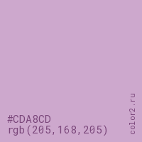 Цвет #CDA8CD в цветовой модели RGB обозначается тремя октетами (205, 168, 205) в десятичном формате и #CDA8CD в шестнадцатиричном (hex) формате, которые являются интенсивностью красного 205 (hex CD), интенсивность зелёного 168 (hex A8) и интенсивность синего 205 (hex CD).