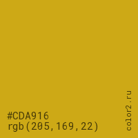 Цвет #CDA916 в цветовой модели RGB обозначается тремя октетами (205, 169, 22) в десятичном формате и #CDA916 в шестнадцатиричном (hex) формате, которые являются интенсивностью красного 205 (hex CD), интенсивность зелёного 169 (hex A9) и интенсивность синего 22 (hex 16).