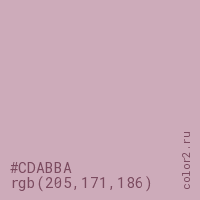 Цвет #CDABBA в цветовой модели RGB обозначается тремя октетами (205, 171, 186) в десятичном формате и #CDABBA в шестнадцатиричном (hex) формате, которые являются интенсивностью красного 205 (hex CD), интенсивность зелёного 171 (hex AB) и интенсивность синего 186 (hex BA).