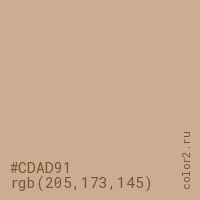 Цвет #CDAD91 в цветовой модели RGB обозначается тремя октетами (205, 173, 145) в десятичном формате и #CDAD91 в шестнадцатиричном (hex) формате, которые являются интенсивностью красного 205 (hex CD), интенсивность зелёного 173 (hex AD) и интенсивность синего 145 (hex 91).