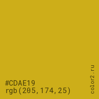 Цвет #CDAE19 в цветовой модели RGB обозначается тремя октетами (205, 174, 25) в десятичном формате и #CDAE19 в шестнадцатиричном (hex) формате, которые являются интенсивностью красного 205 (hex CD), интенсивность зелёного 174 (hex AE) и интенсивность синего 25 (hex 19).