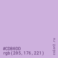 Цвет #CDB0DD в цветовой модели RGB обозначается тремя октетами (205, 176, 221) в десятичном формате и #CDB0DD в шестнадцатиричном (hex) формате, которые являются интенсивностью красного 205 (hex CD), интенсивность зелёного 176 (hex B0) и интенсивность синего 221 (hex DD).