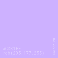 Цвет #CDB1FF в цветовой модели RGB обозначается тремя октетами (205, 177, 255) в десятичном формате и #CDB1FF в шестнадцатиричном (hex) формате, которые являются интенсивностью красного 205 (hex CD), интенсивность зелёного 177 (hex B1) и интенсивность синего 255 (hex FF).