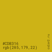 Цвет #CDB316 в цветовой модели RGB обозначается тремя октетами (205, 179, 22) в десятичном формате и #CDB316 в шестнадцатиричном (hex) формате, которые являются интенсивностью красного 205 (hex CD), интенсивность зелёного 179 (hex B3) и интенсивность синего 22 (hex 16).