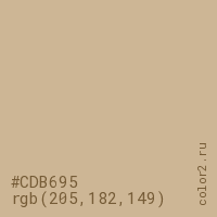 Цвет #CDB695 в цветовой модели RGB обозначается тремя октетами (205, 182, 149) в десятичном формате и #CDB695 в шестнадцатиричном (hex) формате, которые являются интенсивностью красного 205 (hex CD), интенсивность зелёного 182 (hex B6) и интенсивность синего 149 (hex 95).