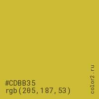 Цвет #CDBB35 в цветовой модели RGB обозначается тремя октетами (205, 187, 53) в десятичном формате и #CDBB35 в шестнадцатиричном (hex) формате, которые являются интенсивностью красного 205 (hex CD), интенсивность зелёного 187 (hex BB) и интенсивность синего 53 (hex 35).