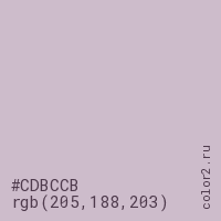 Цвет #CDBCCB в цветовой модели RGB обозначается тремя октетами (205, 188, 203) в десятичном формате и #CDBCCB в шестнадцатиричном (hex) формате, которые являются интенсивностью красного 205 (hex CD), интенсивность зелёного 188 (hex BC) и интенсивность синего 203 (hex CB).