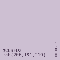 Цвет #CDBFD2 в цветовой модели RGB обозначается тремя октетами (205, 191, 210) в десятичном формате и #CDBFD2 в шестнадцатиричном (hex) формате, которые являются интенсивностью красного 205 (hex CD), интенсивность зелёного 191 (hex BF) и интенсивность синего 210 (hex D2).