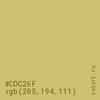 Цвет #CDC26F в цветовой модели RGB обозначается тремя октетами (205, 194, 111) в десятичном формате и #CDC26F в шестнадцатиричном (hex) формате, которые являются интенсивностью красного 205 (hex CD), интенсивность зелёного 194 (hex C2) и интенсивность синего 111 (hex 6F).